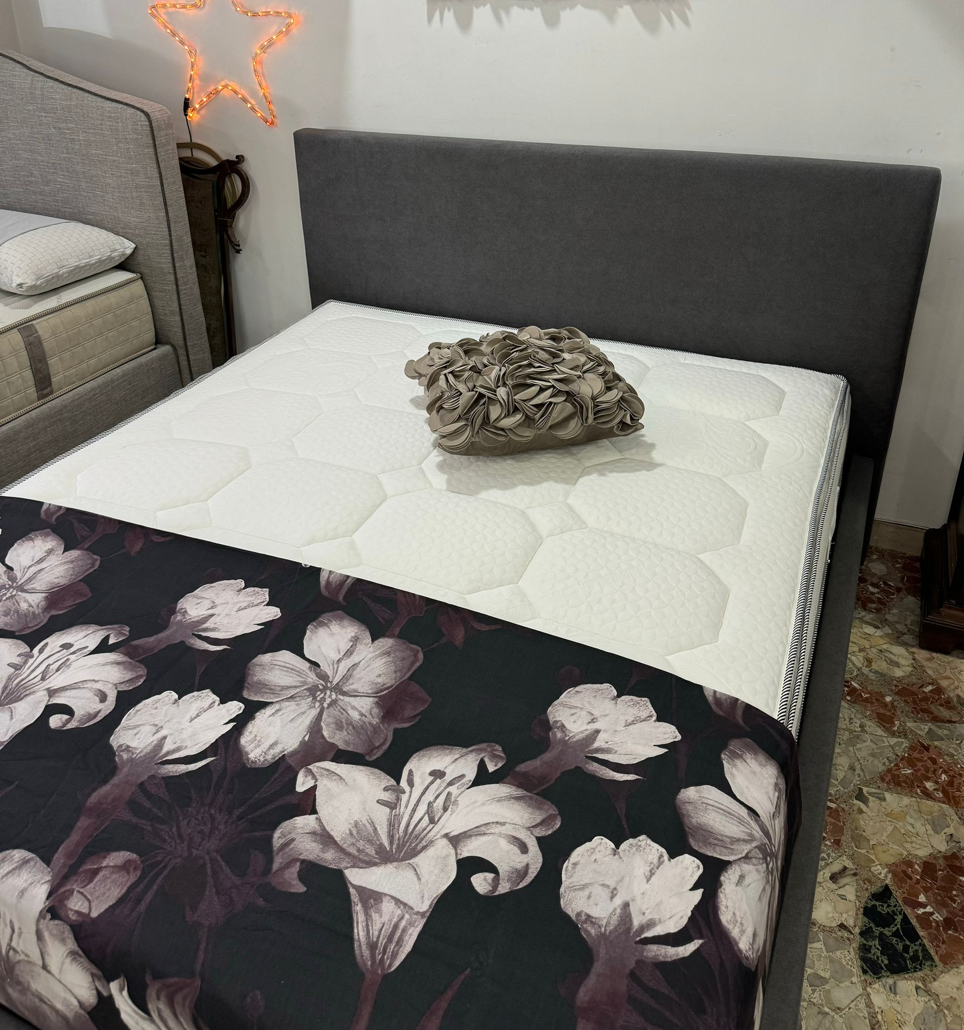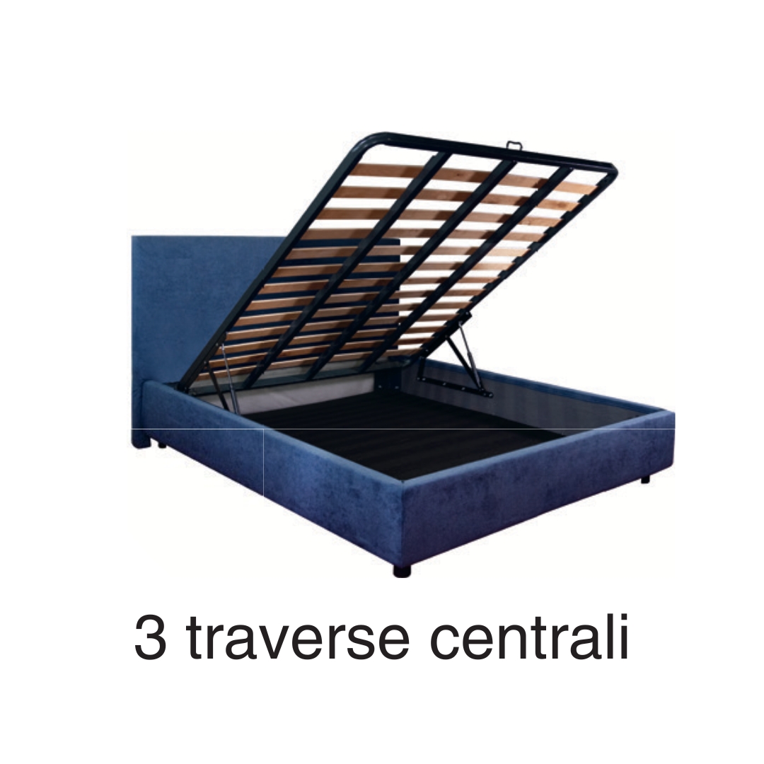 E’ adatto ad arredare ambienti moderni e classici senza alcun pregiudizio e le nostre collezioni, nella versione contenitore, hanno dei fondali alti 1 cm, sostenuti da una sbarra centrale e con un piedino centrale. Il giroletto è completamente sfoderabile e lavabile. La testata è sfoderabile e lavabile. La rete compresa nel prezzo, ha una struttura in ferro e delle doghe a schiena d’asino in legno di faggio, e presenta TRE traverse centrali per non permettere di far avvallare il materasso e avere un pieno sostegno durante il sonno.